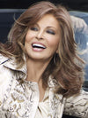 Camera Ready by Raquel Welch is a long-layered synthetic hair wig with side-swept bangs that exudes sexiness. This layered wig combines the natural looking hairline of a Sheer Indulgence lace front cap for off the face styling with the cool, light comfort of a monofilament part. Features include velvet ear tabs and a velvet nape for a smooth comfortable fit. With this style you don't have to sacrifice fit over style, you can have both!