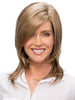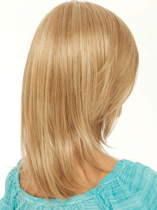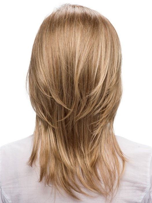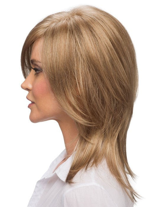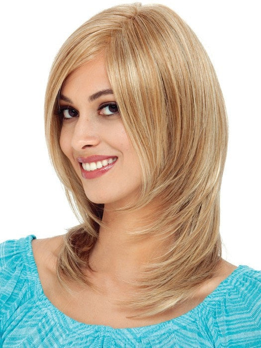 London by Estetica Designs Wigs is a below the shoulder layered cut with side swept bangs and lace part. London wig has a ready to wear front lace line and an open-stretch (capless) cap construction.