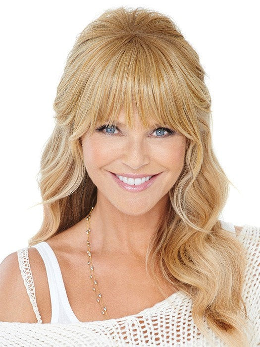 Natural Fringe Clip-in Bang by Christie Brinkley is a layered bang that changes your hairstyle in seconds. The Excelle Heat-Friendly fiber looks and feels just like your own hair and you can style it with your own hair. Flat iron it straight or add a wave.