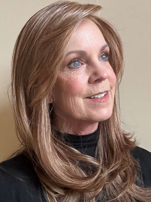 Spotlight Large is a long, straight wig with feminine flair. This heat-friendly synthetic wig has a fringe that can be worn off the face or swept across the forehead. Spotlight Large is also available in an average size cap, a petite cap size, and in an Elite version with a 100% hand-tied cap.