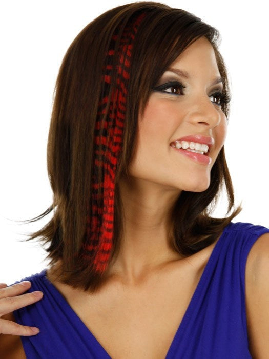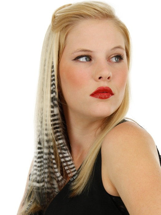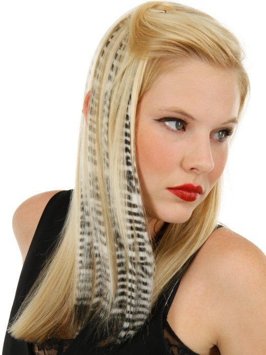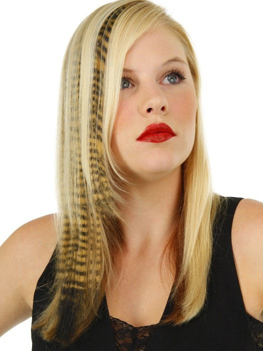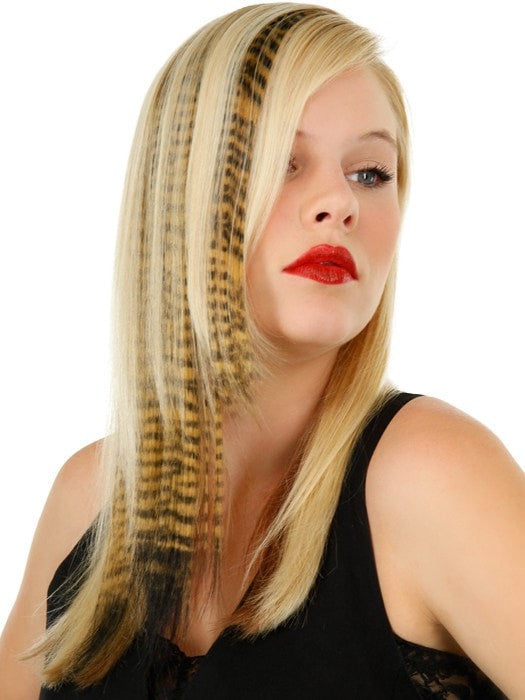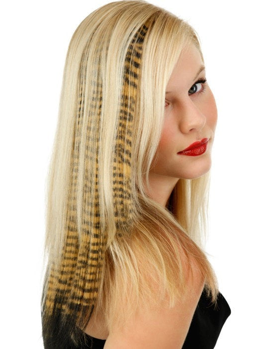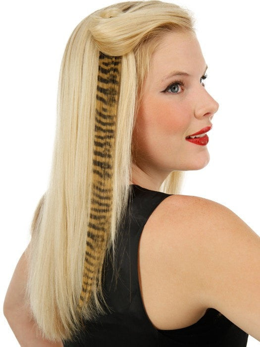 Tiger Print Hair Extensions by Put On Pieces are the Newest fashion item in the Put On Piece’s freestyle collection. Clip-in Color Animal Print is 16\" long hair on a 1\" wide weft that is perfect for creating instant color! Made with their amazing new Tru2Life™ heat-friendly synthetic hair, this piece can be curled or straightened with thermal styling tools to blend perfectly with any style you create. Available in 6 fun and fierce patterns that have been created to work with just about anyone’s hair color.
