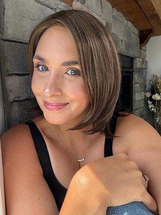 Kristyna @kristynamoore wearing CAMERON LITE by JON RENAU in color 39F38 ROASTED CHESTNUT | Light Natural Ash Brown with 75% Grey Front, graduating to Medium Brown with 35% Grey Nape