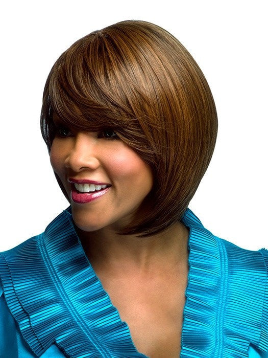 Estee by Vivica Fox is a side swept bob style with long layered bangs featuring a side skin part.