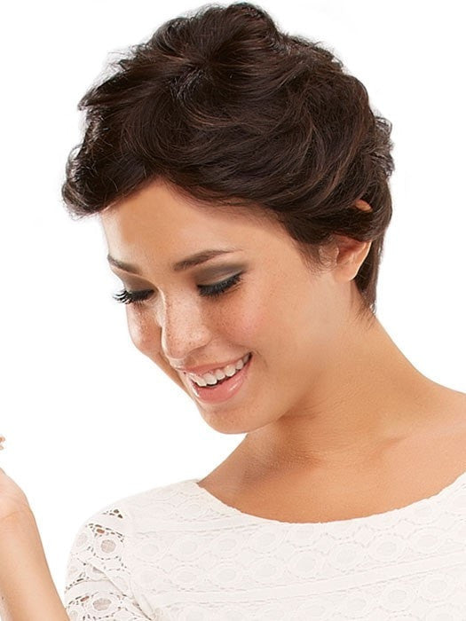 Jane Exclusive Colors lace front wig by Jon Renau ® is a classic short cut. Longer layers along the top and sides create beautiful volume, and fullness. Shorter layers along the back and nape frame the neck perfectly. Jane Exclusive is made with top quality Remy Human Hair that looks and feels incredibly healthy and shiny. Human hair also offers endless styling versatility. Smart lace and monofilament features allow for styling away from the face and multi-directional parting. The hand tied construction allows each hair to swivel freely for natural movement and believability. Jane is fresh, breezy, and the definition of luxurious. Jane Exclusive is available in Renau Natural as well as rooted Colors.