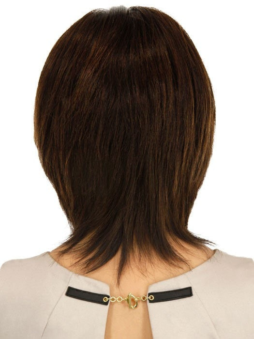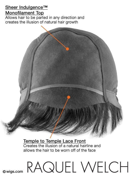 On Cue by Raquel Welch is a 100% human hair collar-length style. This layered wig combines the natural looking hairline of a Sheer Indulgence lace front cap for off the face styling with the cool, light comfort of a monofilament top and hand-knotted base. Features include velvet ear tabs, a velvet nape, and an extended nape for added coverage. Designed with the hair loss client in mind, this wig is comfortable without compromising in style. This wig makes getting ready a breeze!