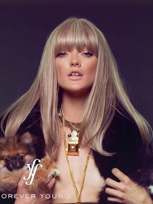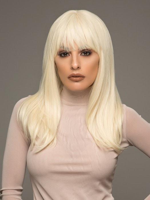 The Perfect Silhouette Wig by Forever Young is a super straight style with a full bang and rounded ends. The heat-friendly fiber allows you to straighten or curl using your favorite hot tools. The sleek layers pictured are ready-to-wear out of the box. The part is located in the center and is machine made to look like your scalp. This cut and hairstyle are on trend and super stylish.