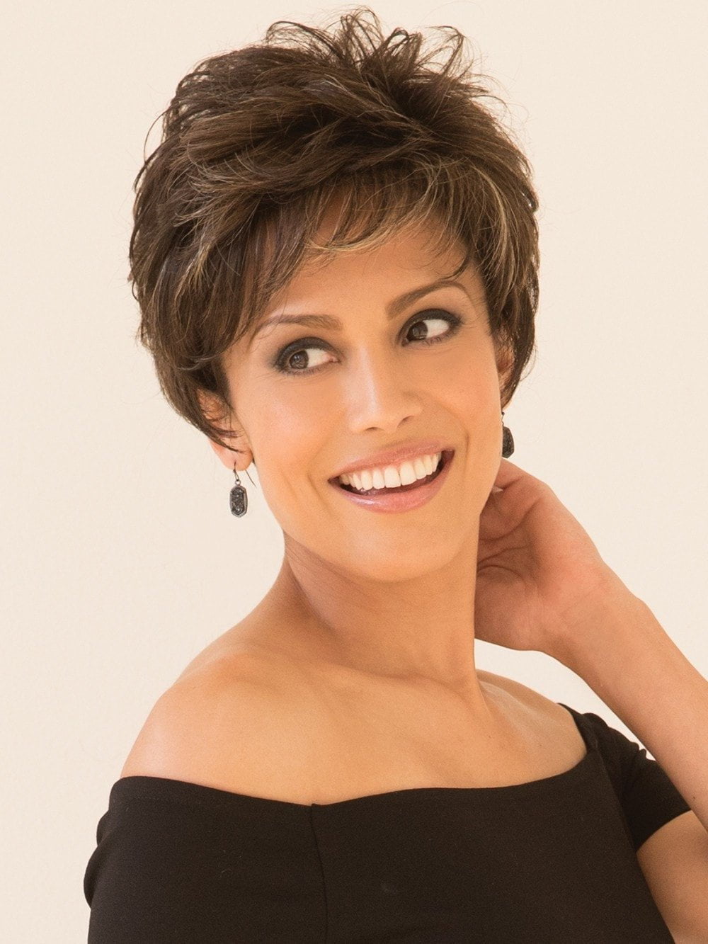 The Rina Wig by Rene of Paris is feathery layered with a graduated look in the back, along with a soft wispy fringe. The side-swept fringe can be styled down or up for a change in look. This soft layered short pixie can be brushed over the top to create a touch of height. Also available in color silver-stone grey.