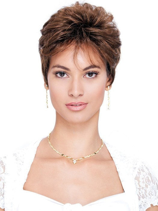 Robin by Estetica Designs Wigs is a short pixie cut wig with a volumized wavy, layered top combined with a bang. Robin has an open-stretch cap (capless) lightweigth construction.
