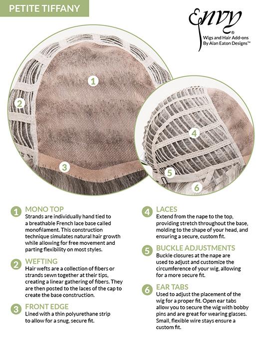 Tiffany Petite by Envy is a short, layered, and pixie cut synthetic wig. You can style it smooth and soft or tousled and spiky. The full-layered bang can be trimmed by your stylist or worn slightly off to the side. To add a natural look with movement, the cap features a monofilament top. You can change the style and texture by applying the Shaping Creme by BeautiMark. Tiffany is also available in Average.