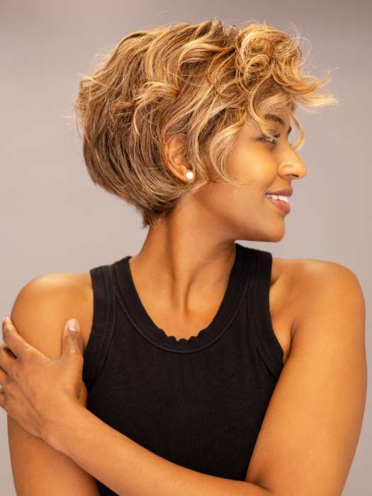 Twisted Pixie by TressAllure showcases a trendy pixie bob with unstructured curls for a carefree hairstyle. The tapered back creates a more streamlined silhouette. Part of the Look Fabulous Realistic Collection, this light-density short wig is crafted with heat friendly synthetic fiber for versatile styling. The monofilament top and lace front give the illusion of hair growth for a realistic appearance.